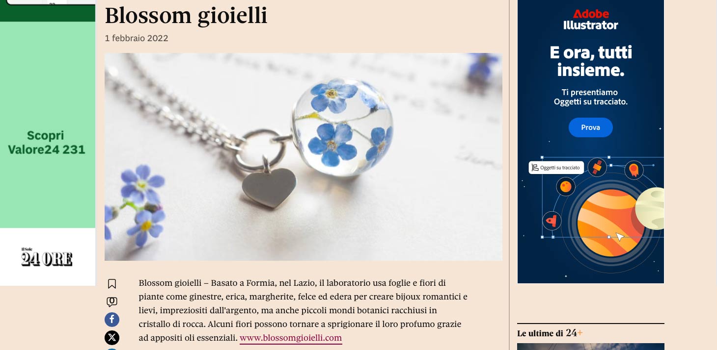 Blossom Gioielli è stato raccontato anche da testate nazionali, tra cuiIl Sole 24 Ore, che ha dedicato un articolo al nostro percorso artigianale e alla filosofia che ci guida